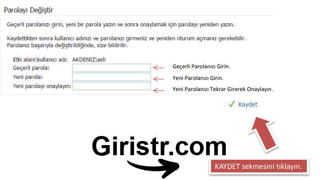 Mail şifresini değiştirmek için 1. mevcut parolanızı girmeniz istenecektir. Sonra 2. Yeni Parolanızı yazmalısınız, 3. yeni parolanızı bir defa daha yazın ve Kaydet butonuna tıklayın. Parola değiştirme süreciniz tamamlanmıştır.