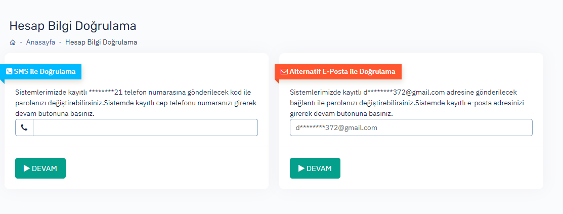 Kullanıcı isminizi girdikten sonra Hacettepe Mail sisteminde kayıtlı olan cep telefonu ve alternatif e-posta bilgilerinizin bir kısmı görünür hale gelir. Hangisine erişiminiz varsa o bilginin tamamını girerek “Devam” butonuna basın.